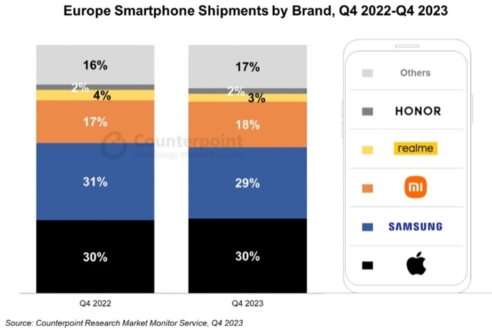 (2023年四季度欧洲手机市场份额,图源:Counterpint Research)