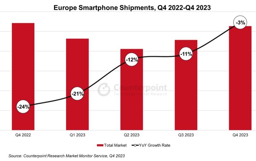 (跌幅放缓,欧洲手机市场走向回暖,图源:Counterpint Research)
