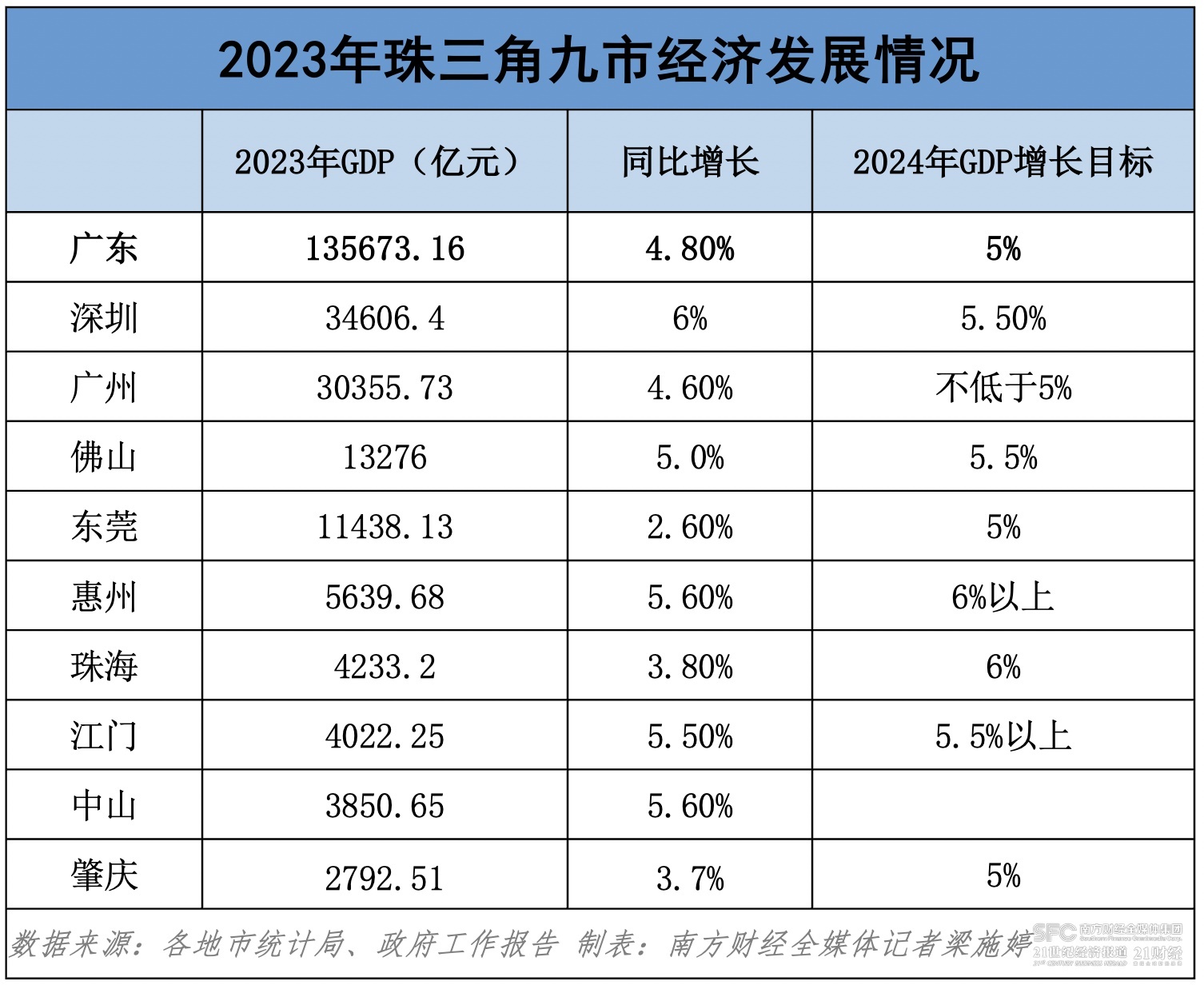 近日,广东各城市的两会相继召开,并纷纷明确了2024年的发展目标。具体来看,深圳、佛山、惠州、江门GDP在2023年均实现了超过全省平均经济增速,并且在2024年进一步提出更高的发展目标,GDP目标增长分别为5.50%或以上。